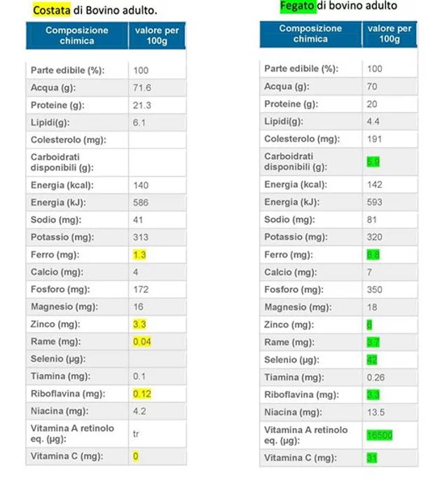 Alcuni valori sono simili: acqua, proteine, grassi, ma i micronutrienti, minerali e vitamine sorprendono: il fegato ad esempio contiene 6 volte più ferro della bistecca, molto più selenio e vitamine del gruppo B, il doppio dello zinco e 90 volte più rame. Contiene inoltre vit.A e vit.C praticamente assenti nel muscolo.