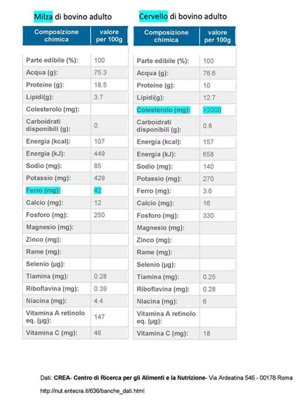 Per non parlare della milza che è l’organo con il maggior quantitativo di ferro, ben 42 mg (in media) contro 1,3 mg della bistecca.